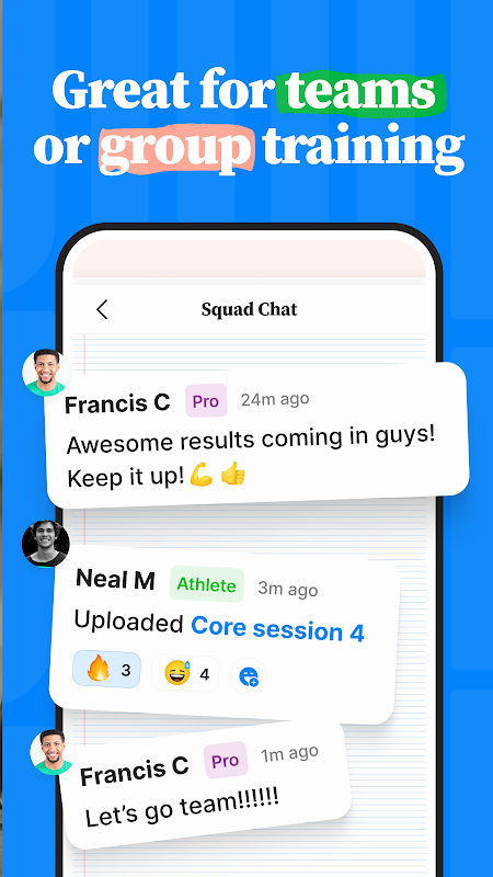 শুধুমাত্র আমন্ত্রিত ওয়ার্কআউট স্কোয়াড তৈরি করে বা আপনার প্রশিক্ষণ জার্নাল ভাগ করে আপনার বন্ধু এবং সতীর্থদের আপনার প্রশিক্ষণ যাত্রায় আনুন। ট্রেনিং স্কোয়াড আপনাকে ওয়ার্কআউট, পোস্ট এবং চ্যাট শেয়ার করতে দেয়। তাদের জন্য ব্যবহার করুন: ক্রীড়া দল (রাগবি, সকার, ল্যাক্রোস, রোয়িং, ফুটবল, সাঁতার, হকি, নেটবল, বাস্কেটবল, ইত্যাদি); বন্ধুদের দল একটি ইভেন্টের জন্য উপযুক্ত হচ্ছে (ছুটির দিন, বিবাহ, গ্রীষ্ম); ওয়ার্কআউট বন্ধুদের; জিম চশমা; ছোট গ্রুপ পিটি; ফিটনেস ইভেন্ট (হাইরক্স, কার্যকরী ফিটনেস, ট্রায়াথলন); বাহিনী (সেনাবাহিনী, নৌবাহিনী, বিমান বাহিনী, মেরিন, আইন প্রয়োগকারী, ফায়ার); স্কুল, কলেজ এবং চ্যালেঞ্জ।