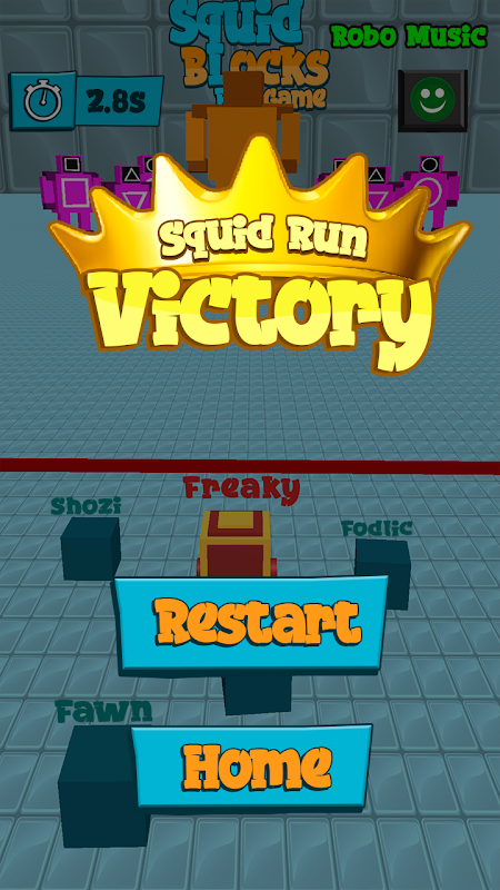 • Epic Game Graphics: The game graphics are geometric and simple with the original The Squid Game theme. The square-shaped players and huge robots on an immense arena make a complete game scene.