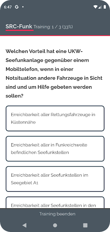 এসআরসি (সীমিত রেডিও শর্ট শংসাপত্র শংসাপত্র) এর প্রশিক্ষণ প্রোগ্রাম একটি প্রশিক্ষণ মোড, সমস্ত 12 টি পরীক্ষা শিট এবং সিয়েরা পাপা অন্তর্ভুক্ত রয়েছে, আন্তর্জাতিক বানান বর্ণমালার অনুশীলনের জন্য প্রোগ্রাম।