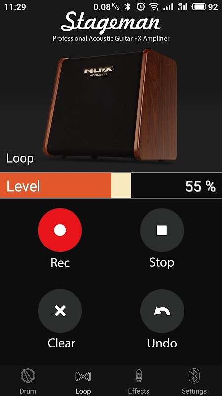 এই অ্যাপ্লিকেশন ব্যবহারকারী ব্লুটুথ সঙ্গে স্টেজম্যান শাব্দ পরিবর্ধক অন্তর্নির্মিত ড্রাম নিদর্শন এবং looper ফাংশন ব্যবহার করতে পারবেন। ব্যবহারকারী এম্প্লিফায়ারের প্রভাব পরামিতিগুলি নিয়ন্ত্রণ করতে পারে, যেমন কোরাস এবং রিভারব রেট এবং গভীরতা। প্রতিটি চ্যানেলে ব্যক্তিগত প্রভাবগুলি অ্যাপ দ্বারা নিয়ন্ত্রণ করা যেতে পারে, অ্যাকোস্টিক গিটারের জন্য চ্যানেল 1 এবং কন্ঠের জন্য চ্যানেল 2। মোট ২0 টি ড্রাম নিদর্শন এবং 60 সেকেন্ডের লুপার একসাথে ব্যবহার করা যেতে পারে।