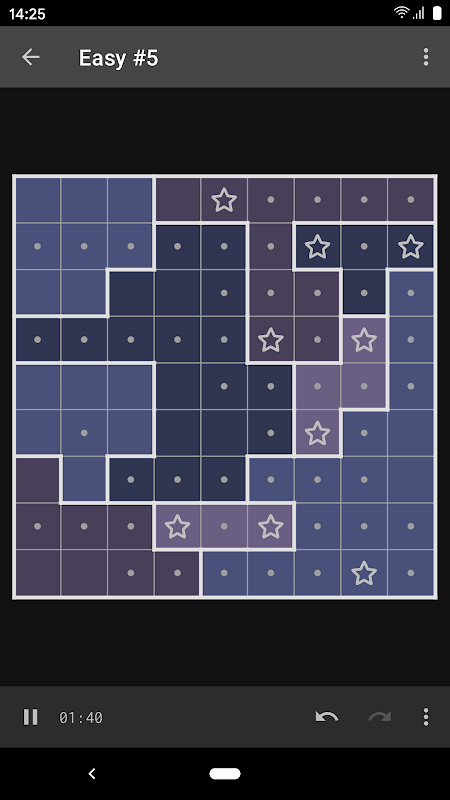 স্টার ব্যাটেল একটি চ্যালেঞ্জিং লজিক পাজল। প্রতিটি সারি, প্রতিটি কলাম এবং প্রতিটি অঞ্চলে দুটি তারা রাখুন, তবে নিশ্চিত করুন যে তারাগুলি স্পর্শ না করে, এমনকি তির্যকভাবেও! প্রতিটি ধাঁধার ঠিক একটি সমাধান আছে, যা যুক্তির মাধ্যমে খুঁজে পাওয়া যায়। কোন অনুমান প্রয়োজন!