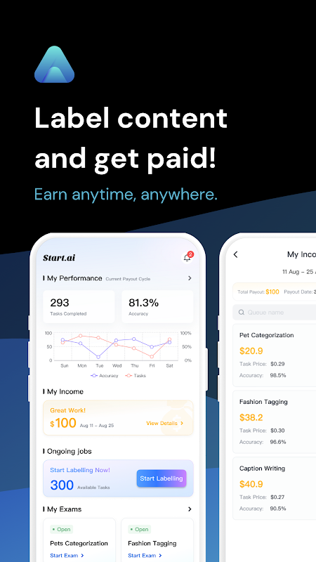 Start.ai হল একটি মজাদার, নমনীয় প্ল্যাটফর্ম যা আপনাকে ছবি শ্রেণীকরণ, পাঠ্য বিশ্লেষণ এবং ভিডিও ট্যাগ করার মতো সহজ কাজগুলি সম্পূর্ণ করার মাধ্যমে উপার্জন করতে দেয়৷ আপনি ফ্রিল্যান্স কাজ বা ফুল-টাইম গিগ খুঁজছেন না কেন, Start.ai বিশ্বের যেকোনো জায়গা থেকে আপনার নিজের সময়সূচীতে কাজ করা সহজ করে তোলে। কোনো নির্দিষ্ট সময় নেই, কোনো সীমা নেই—শুধু যখনই এটি আপনার জন্য উপযুক্ত তখনই কাজ করুন।