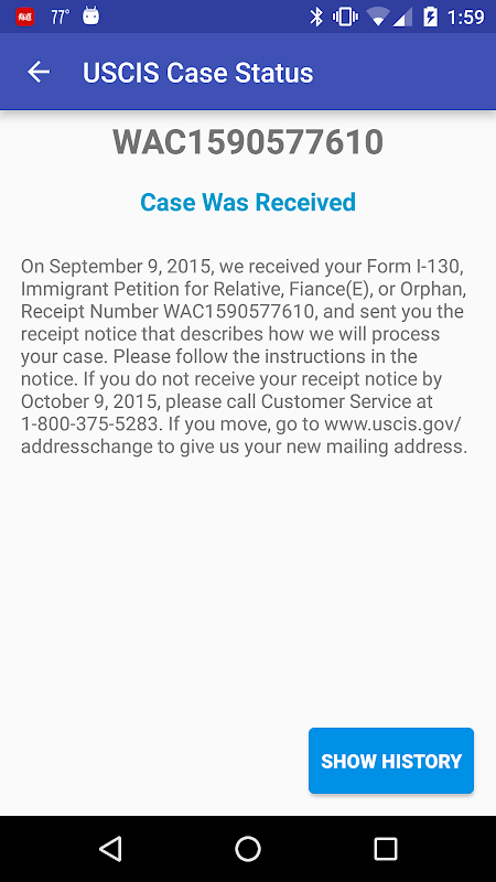 এই পণ্য USCIS সঙ্গে সম্বন্ধযুক্ত করা হয় না. আমরা আপনাকে আপনার কেস চেক করতে সাহায্য করার জন্য এই টুল বিকাশ. অ্যাপ্লিকেশন শুধু ফলাফল পেতে USCIS অফিসিয়াল ওয়েবসাইট করার জন্য query পাঠাতে.