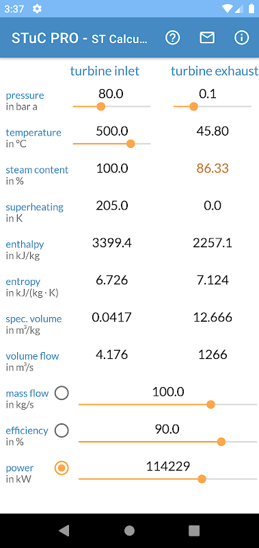 আপনি সহজেই অ্যাপ্লিকেশন স্লাইডার দ্বারা সীমানা শর্তগুলি সম্পাদনা করতে পারেন বা মান ইনপুট হিসাবে সরাসরি করতে পারেন। প্রতিটি গণনার খাঁড়ি চাপের জন্য, খাঁড়ি তাপমাত্রা এবং নিষ্কাশন চাপ বাধ্যতামূলক। তিনটি প্যারামিটারের একটিতে ভর প্রবাহ, দক্ষতা বা শক্তি গণনা করা যায়। আপনি এই তিনটি পরামিতি মধ্যে পরিবর্তন করতে পারেন।