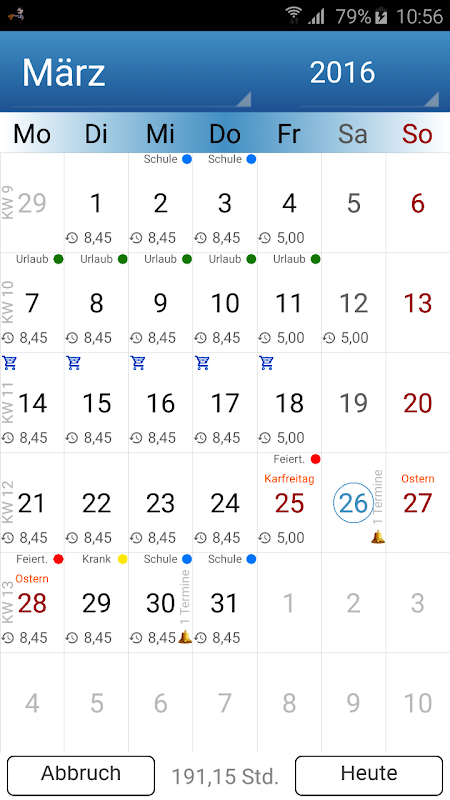 3. Farbige Anzeigen der schon eigegebenen Stunden im Kalenderblatt z.B. Grün für genommenen Urlaub.