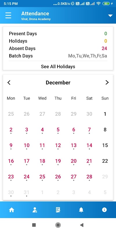 This facility is available for to give information to parents of their child presence in batch through this android app.