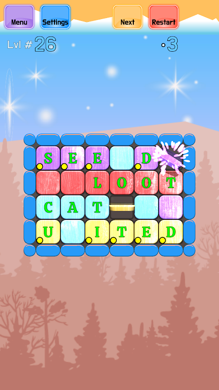 এখানে 5 টি গেমের মোড রয়েছে যা ব্যবহারকারীরা একক শব্দ থেকে শুরু করে 5 শব্দ পর্যন্ত যেতে পারে play প্রতিটি শব্দ একটি পৃথক লাইনে স্থাপন করা উচিত। আমরা খুব পরিশীলিত শব্দ ব্যবহার করি না, তবে একাধিক সমাধান গৃহীত হয়, সুতরাং আপনি আমাদের কল্পনাটি যতক্ষণ না আমাদের শব্দভাণ্ডারে থাকবেন ততক্ষণ আপনি মুক্ত কল্পনা চালিয়ে যেতে পারবেন। যদি আমরা কিছু শব্দ অনুপস্থিত থাকে তবে দয়া করে আমাদের সাথে যোগাযোগ করুন এবং আমরা সেগুলি যুক্ত করব। বোর্ডটি শুরুতেই বদলে যায়, প্রতিটি লাইনে একটি বৈধ ইংরেজি শব্দ তৈরি না করা অবধি ব্যবহারকারীকে টাইলসের দম্পতিদের অদলবদল করতে হবে।