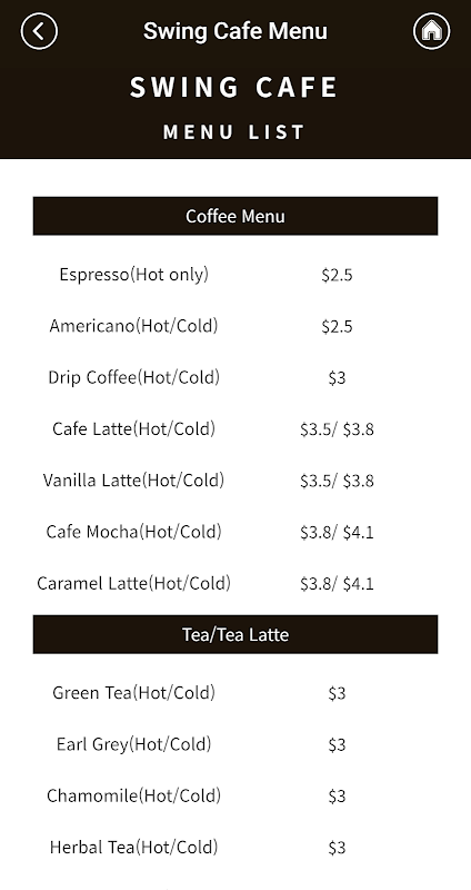 অ্যাপ উত্পাদন পরিষেবা Swing2App দিয়ে তৈরি সুইং ক্যাফে নমুনা অ্যাপ
