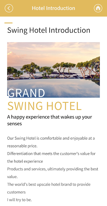 এটি হোটেলের একটি নমুনা অ্যাপ যা অ্যাপ উৎপাদন পরিষেবা Swing2App দিয়ে তৈরি।