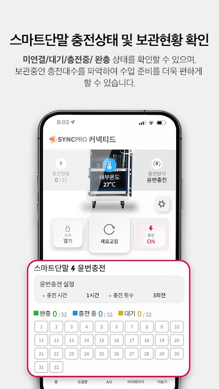 SyncPro, কোরিয়ার একমাত্র IoT চার্জিং স্টোরেজ বক্স, Wi-Fi ওয়্যারলেস যোগাযোগের মাধ্যমে দূরবর্তীভাবে পর্যবেক্ষণ এবং নিয়ন্ত্রিত হয়।