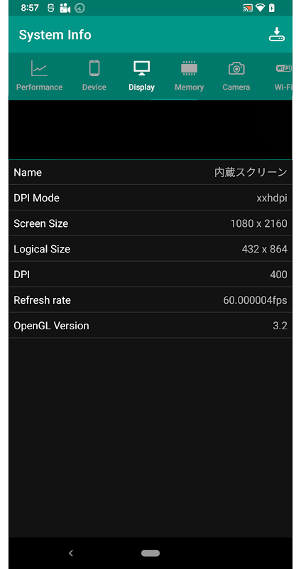 DPI মোড (উদাঃ xxdpi) / ডিপিআই / পর্দা আকার / লজিক্যাল পর্দা আকার / refersh হার