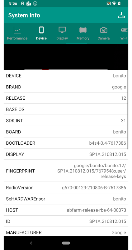 এই অ্যাপটি প্রদর্শনী সিস্টেম তথ্য ওএস, প্রদর্শন, মেমরি, সেন্সর সম্পর্কে যা।