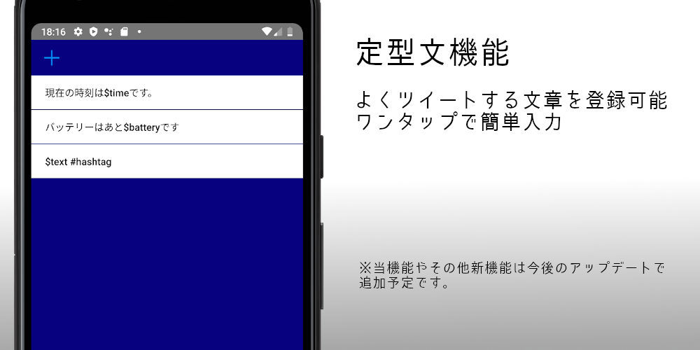 ・যে বাক্যগুলি প্রায়শই স্থির বাক্যাংশ ফাংশন দিয়ে টুইট করা হয় সেগুলি নিবন্ধন করা সম্ভব (*এই ফাংশনটি ভবিষ্যতের আপডেটে প্রয়োগ করা হবে।)