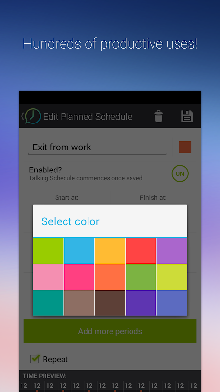 এই অ্যাপ্লিকেশন ব্যবহারকারী পরিকল্পিত বা ম্যানুয়াল, একক বা একাধিক সময় সময়সূচী পরিকল্পনা করতে পারবেন। উপরন্তু সময়সূচী ব্যবহারকারীর চাহিদা মেটাতে flexibly পুনরাবৃত্তি করা যেতে পারে।