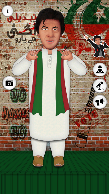 • Real time appearance of Imran Khan as seen in his addresses is given in the form of a realistic cartoon, which responds to different options