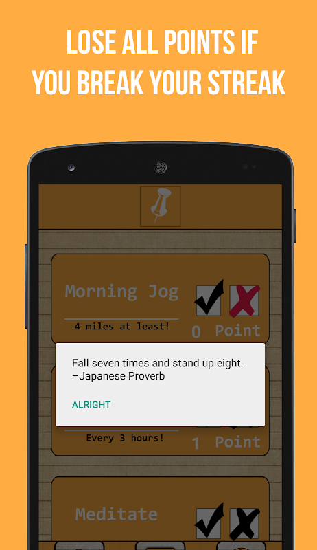 ★Motivational Quotes Everyday, press the "Check" if you have accomplished your task and the "X" if you haven't, you will receive a motivational quote regardless of whether or not you've succeeded.