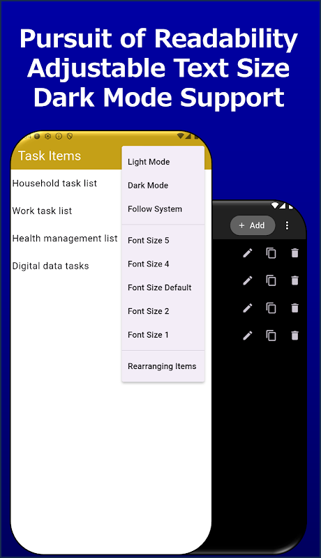 • আরামদায়ক দেখার জন্য সামঞ্জস্যযোগ্য টেক্সট আকার (৫ স্তর)।