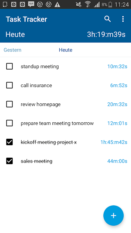 Task Tracker will help you keep track of your daily activities and assignments. Just create a new to-do and it will be added to your list of tasks and activities for the current day. Start the timer with a simple tap on the activity or duty you are about to perform. The timer of the active task is always easily visible. The tracking of your time also works in the background.