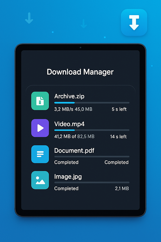 ভিডিও, সঙ্গীত, ডকুমেন্ট এবং ইন্টারনেট থেকে অন্য যেকোনো ফাইল - এক পরিষ্কার জায়গায় আপনার সমস্ত ডাউনলোড নিয়ন্ত্রণ করুন।