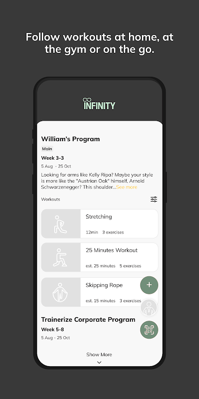 আপনার ওয়ার্কআউট ট্র্যাক করুন, আপনার খাবারের পরিকল্পনা করুন এবং প্রতিটি পদক্ষেপে অনুপ্রাণিত থাকার জন্য আপনার অগ্রগতি নিরীক্ষণ করুন। এছাড়াও, টিম ইনফিনিটি সম্প্রদায়ের সাথে সংযোগ করুন, যেখানে আমরা সবাই একত্রিত হই এবং আপনার লক্ষ্য অর্জনের পথে একে অপরকে উত্সাহিত করি এবং একটি ভারসাম্যপূর্ণ, স্বাস্থ্যকর জীবনধারা বজায় রাখি।