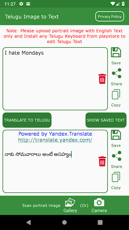 Users can upload the image from Gallery or Camera and get text from it (Telugu Image to Text). Once scanned, Users can
