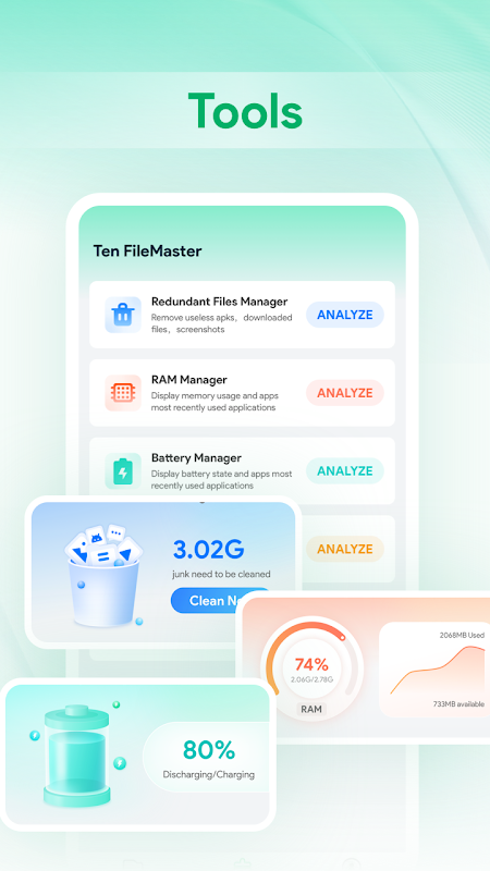 টেন ফাইলমাস্টার ফাইল ব্রাউজ করার জন্য একটি ছোট ইউটিলিটি পণ্য। এটির সাহায্যে, আপনি আপনার ডিভাইসে শুধুমাত্র ছবি, ভিডিও, অডিও, ডক্স, জিপ এবং অন্যান্য ফাইল দেখতে পারবেন না কিন্তু গত তিন দিনে জেনারেট করা ফাইলগুলিতেও অ্যাক্সেস পাবেন। টেন ফাইলমাস্টার আপনাকে আপনার ডিভাইসটিকে আরও ভালভাবে বুঝতে সাহায্য করার জন্য অনেকগুলি সরঞ্জামও অফার করে, যার মধ্যে অপ্রয়োজনীয় ফাইল ম্যানেজার, লার্জ ফাইল ম্যানেজার, ডুপ্লিকেট ফাইল ম্যানেজার, RAM ম্যানেজার এবং ব্যাটারি ম্যানেজার রয়েছে। সামগ্রিকভাবে, টেন ফাইলমাস্টার আপনাকে আপনার ডিভাইসে আরও অন্তর্দৃষ্টি অর্জন করতে দেয়।