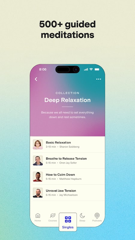 - 500+ গাইডেড মেডিটেশন: উদ্বেগ, ফোকাস, ঘুম এবং আরও অনেক কিছুর মতো বিষয়গুলি কভার করে একটি বিস্তৃত লাইব্রেরি অ্যাক্সেস করুন৷