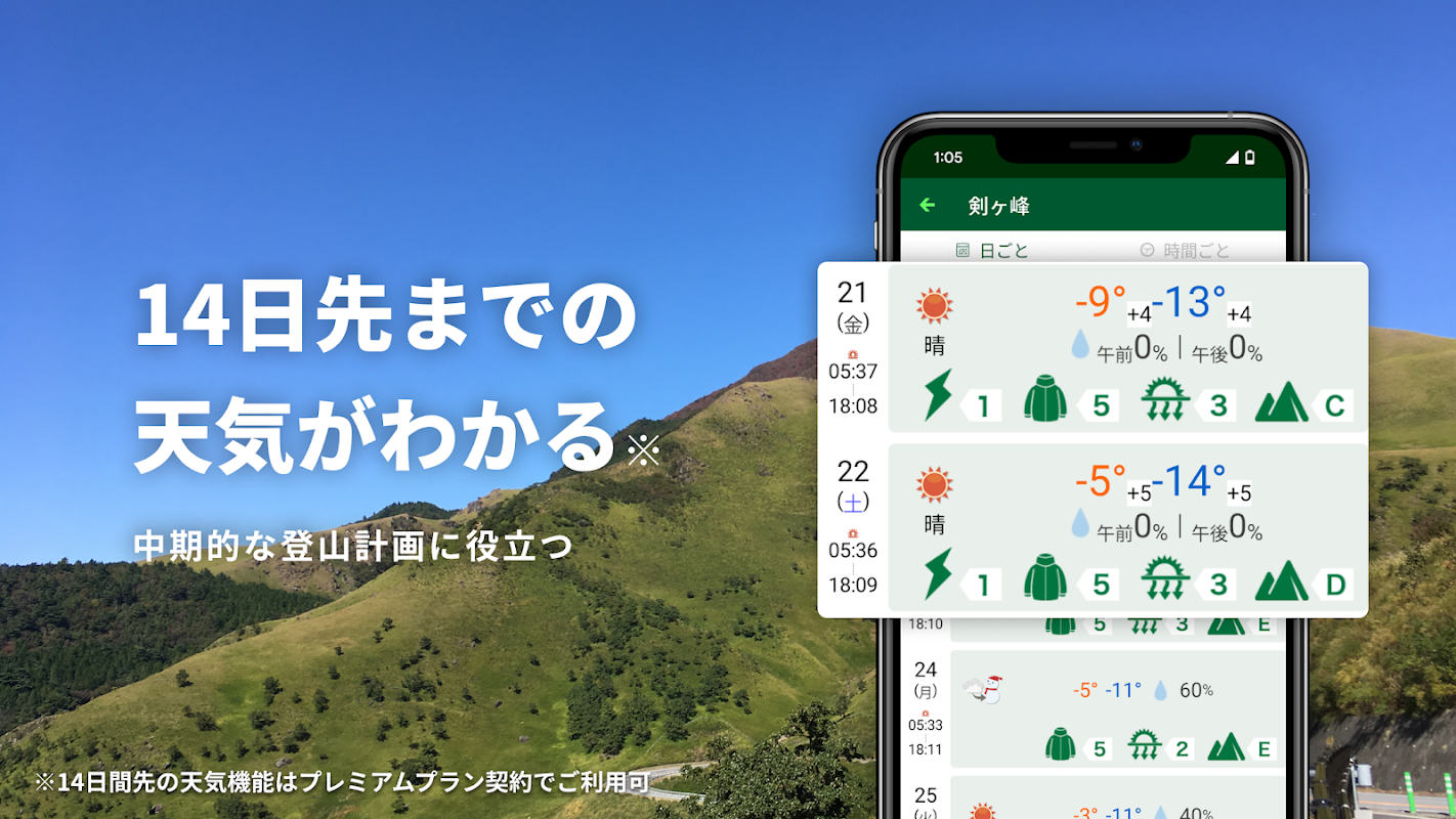 *Tenki.jp ক্লাইম্বিং ওয়েদার প্রিমিয়াম প্ল্যানের জন্য। লাইট প্ল্যানের মাধ্যমে, আপনি 7 দিন আগে চেক করতে পারবেন