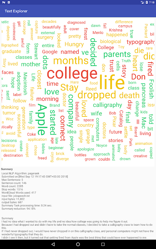 Text Explorer is an automatic text summarization utility featuring WordCloud, and Force Graph Visualizations. The most important sentences derived from the input data are given a rank and become part of the summary it produces. Import Text from Clipboard, files, or URLs. The app supports direct PDF and HTML file imports. It produces a text summary and top keywords by breaking down input sentences to their word relationships, removing stopwords (non-contextual words), then scoring the strength of a given sentence in relation to the other sentences in the input data. This provides you a ranking of the most important sentences and a short summary of the input text (shareable).