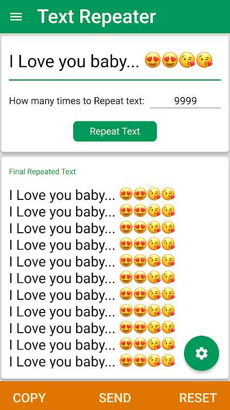 টেক্সট রিপিটার আপনাকে টেক্সট রিপিট করার একটি ভালো বিকল্প দেয় যখন আপনার প্রয়োজন হয়। টেক্সট রিপিটার টেক্সট এবং অন্যান্য ধরনের ইমোটিকন এবং ফরম্যাটিং সমর্থন করে। আপনি আপনার বোমা হামলার বার্তাগুলির জন্য একটি অনন্য পাঠ্য তৈরি করতে পারেন এবং এই পাঠ্য স্প্যামারের সাথে মজা করতে পারেন। এই টেক্সট বোম্বার অল্পবয়সী ছেলে-মেয়েদের জন্য আরও মজাদার যারা সবসময় টেক্সটিংয়ের পুনরাবৃত্তি করে টেক্সট লেখেন। আপনাকে আর লিখতে হবে না কারণ আমাদের টেক্সট রিপিটার অনেক বৈশিষ্ট্য প্রদান করে। এখানে টেক্সট রিপিটার অ্যাপের উল্লেখযোগ্য সুবিধা রয়েছে।