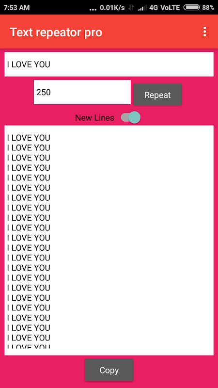 Many times we want to send repeated text messages to our friends on WhatsApp or facebook so we found that we must copy/paste the same text multiple times which is a boring process! but with our Text Repeater you just have to write the text you want and also you can include emoji, then choose the number of repetition you want and click Load then booom your repeated text is ready, so you can copy or share it with your friends easily on any social network and chat:watssap, Instagram, snapchat, also at comments.