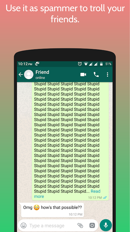 আপনার বন্ধুদের স্প্যাম বার্তা পাঠান এবং সরাসরি পুনরাবৃত্তি টেক্সট ভাগ করে অথবা তাদের অনুলিপি করে যে কোনো সামাজিক মিডিয়া অ্যাপস / ওয়েবসাইটের উপর তাদের দানব।