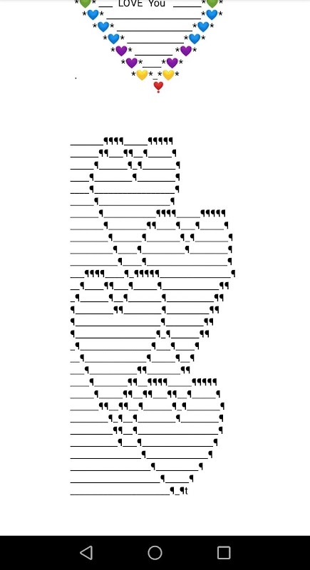 পাঠ্য শিল্প হ'ল পাঠ্য আকারের বিশাল সংগ্রহ। হৃদয় আকার এবং ভালবাসার আকার। পাঠ্যআর্ট আপনাকে হৃদয় Ascii প্রেমের স্টাইলগুলি তৈরি করতে দেয়। বিনামূল্যে ভাগ করার জন্য ইমোজি হার্ট টেক্সট আর্ট তৈরি করুন। টেক্সটআর্ট সুন্দর প্রতীক এবং পাঠ্য শিল্পের সাথে ভালোবাসার ascii পাঠ্য শৈলীগুলি দেখানোর সেরা উপায়। সেরা ascii massege এবং দীর্ঘ টেক্সটআর্ট বার্তা তৈরি করুন।