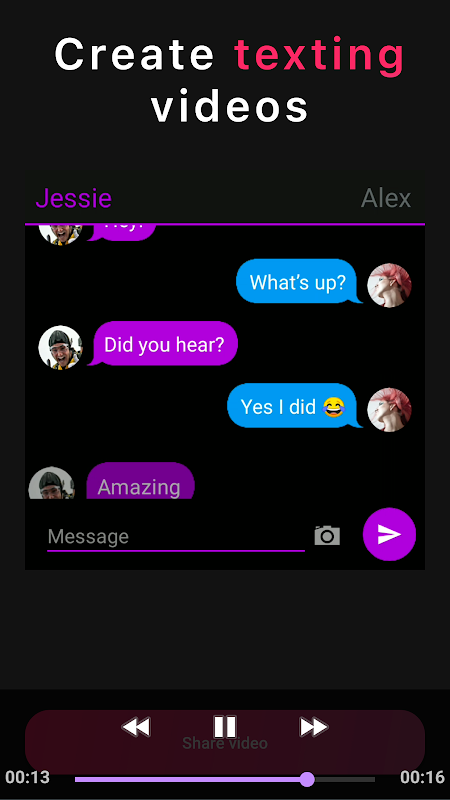 TextingStory আপনাকে যেকোন মেসেজিং অ্যাপের মতই কথোপকথন লিখতে দেয়, আপনি বার্তা এলাকার উপর বাম বা ডানদিকে সোয়াইপ করে পাশ পাল্টাতে পারেন। এছাড়াও আপনি অক্ষরদের নাম টিপুন করতে পারেন.
