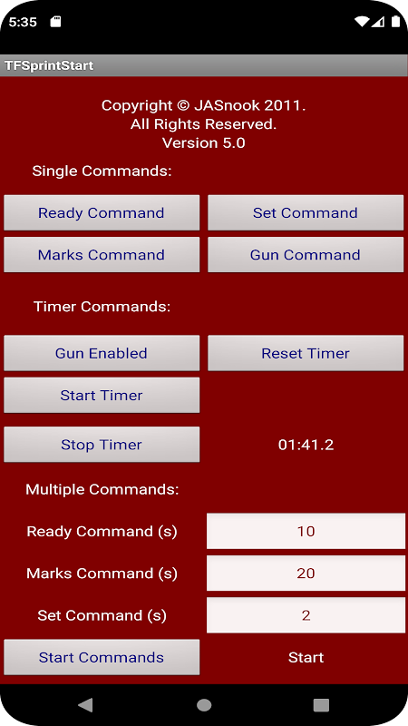 প্রদত্ত একাধিক স্টার্ট কমান্ডের মধ্যে রয়েছে রেডি সিগন্যাল, অন ইয়োর মার্কস, সেট এবং গান ফায়ারড। সামঞ্জস্যযোগ্য পরামিতি প্রতিটি কমান্ডের মধ্যে বিলম্বের সময় প্রদান করে। সেট পরামিতি একটি র্যান্ডম উপাদান আছে.