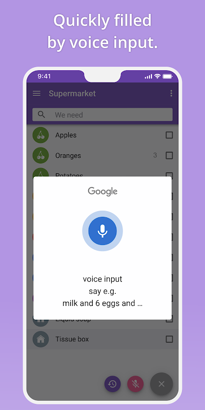 "সেই কেনাকাটার তালিকা" আপনাকে রেকর্ড সময়ের মধ্যে আপনার মুদিখানার তালিকা তৈরি করতে সাহায্য করে, উদাহরণস্বরূপ শুধুমাত্র আপনার ইতিহাস থেকে আইটেম যোগ করে বা ভয়েস ইনপুটের মাধ্যমে।
