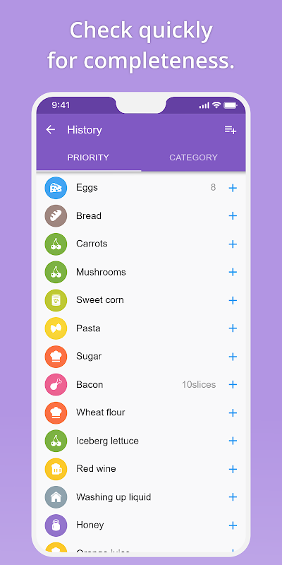 দ্রুত যোগ করুন... প্রায় 1000টি শ্রেণীবদ্ধ এবং অগ্রাধিকার দেওয়া নিবন্ধ এবং বুদ্ধিমান অনুসন্ধান ফাংশনের বিশাল, প্রসারণযোগ্য আইটেম সংগ্রহের জন্য ধন্যবাদ। আপনি যখন প্রথম অক্ষরটি প্রবেশ করেন, সংশ্লিষ্ট আইটেমটি সাধারণত ইতিমধ্যে উপস্থিত হয়। অথবা আপনি কেবল আপনার নিজের ইতিহাস থেকে আইটেম যোগ করতে পারেন. পরিমাণ, একক এবং বিভাগ স্বয়ংক্রিয়ভাবে স্বীকৃত হয় - এমনকি ভয়েস ইনপুট ব্যবহার করার সময়ও।