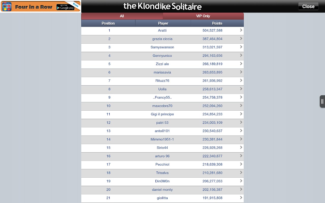 ক্লোন্ডাইক সলিটায়ার একটি 'একক' গেম, তবে আপনি সারা বিশ্ব থেকে আপনার বন্ধুদের এবং নতুন প্রতিপক্ষের বিরুদ্ধে আপনার ক্ষমতা প্রমাণ করতে পারেন: দ্রুত কিন্তু পুঙ্খানুপুঙ্খভাবে চিন্তা করুন এবং সমাধান করুন। তারপরে একচেটিয়া গ্লোবাল হাই-স্কোরে আপনার স্কোর যোগ করুন এবং কে সেরা তা খুঁজে বের করুন।