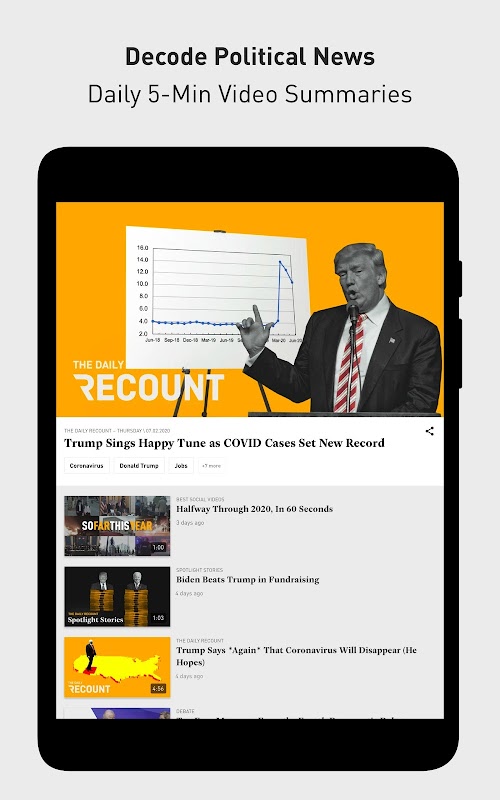 ডেইলি রিকউন্টটি দেখুন: একটি ভিডিও ম্যাসআপ যা আজকের রাজনৈতিক ঘটনাগুলি আপনাকে 5 মিনিট বা তারও কম সময়ের মধ্যে বুঝতে সহায়তা করার জন্য traditionalতিহ্যবাহী সংবাদ কভারেজটির পুনরায় রূপ দেয়।