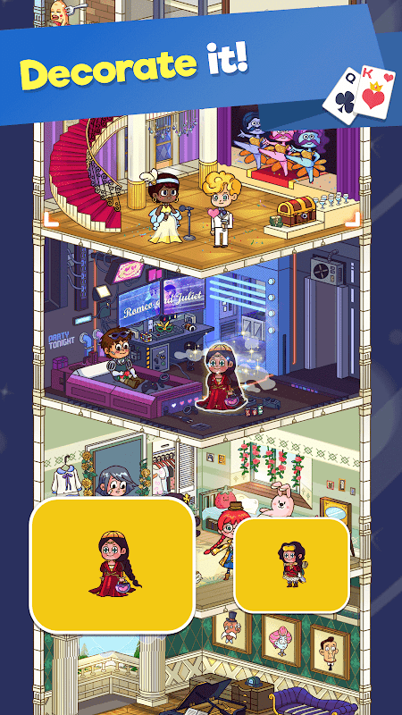 থিম সলিটায়ার আপনাকে আপনার নিজস্ব সলিটায়ার শহরের টাওয়ারগুলি সাজাতে এবং তৈরি করতে দেয়। আপনার নিজস্ব অনন্য যাদু ট্রাই টাওয়ার এবং সুন্দর কক্ষগুলিতে ভরা ট্রাইপিকস বিল্ডিংগুলি তৈরি করতে এই সলিটায়ার ট্রাইপিক্স কার্ড গেমটিতে আপনার নিজের অভ্যন্তর, প্রপস এবং অক্ষরগুলি বেছে নেওয়ার বিকল্প থাকবে!