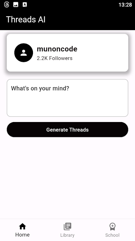 আপনার সৃজনশীলতা প্রকাশ করুন এবং ThreadsAI এর সাথে সোশ্যাল মিডিয়াতে দাঁড়ান! এই যুগান্তকারী অ্যাপ্লিকেশনটি আপনাকে বিষয়বস্তু ধারণা তৈরি করতে এবং অনায়াসে পোস্ট লিখতে সাহায্য করার জন্য কৃত্রিম বুদ্ধিমত্তার শক্তি ব্যবহার করে।
