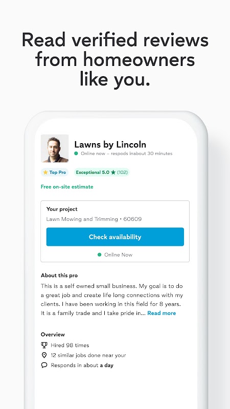 ঠিকাদার বা পরিষেবাগুলির জন্য অনুসন্ধান করুন, মূল্য এবং পর্যালোচনাগুলি পরীক্ষা করুন এবং পেশাদারদের সাথে সরাসরি চ্যাট করুন৷