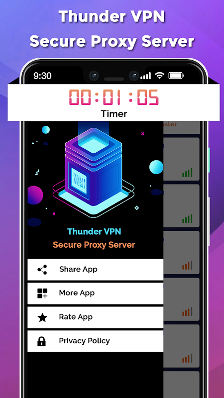 Thunder VPN-Secure Proxy Server app with you just needs to tap on the start button to download country list and tap on your choice country area and to access any blocked site to unblock it.