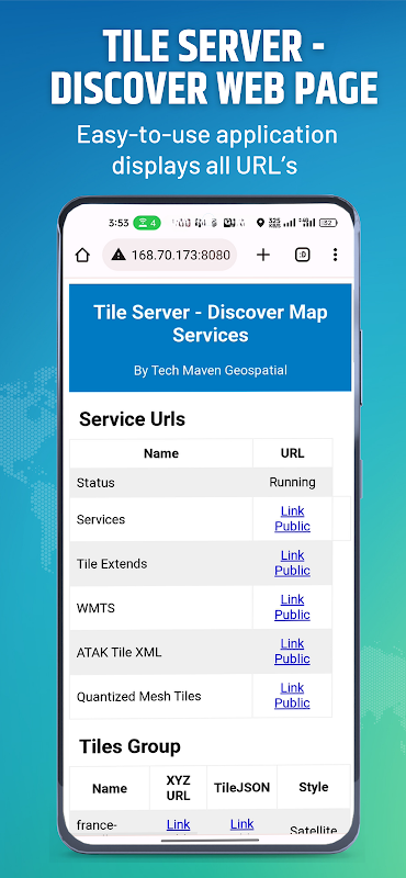 অন্যান্য ম্যাপিং ক্লায়েন্ট বা অ্যাপ্লিকেশন স্ট্যান্ডার্ড এক্সওয়াইজেড টাইল সার্ভার ইউআরএল ব্যবহার করতে পারে (যেমন: HTTP: // আইপ্যাড্রেস: 8080 / getGPKGRasterTile / নাম / / / .png বা HTTP: // আইপ্যাড্রেস: 8080 / getMBTilesRasterTile / নাম / {z- র} / {এক্স} / .png)