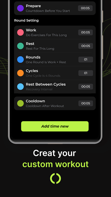 কাস্টমাইজযোগ্য বৈশিষ্ট্য সহ আপনার নিজস্ব ওয়ার্কআউটগুলি সেট আপ করুন, সম্পাদনা করুন এবং সংরক্ষণ করুন৷ আপনার পছন্দ হিসাবে অনেক ব্যবধান যোগ করুন. আপনি 10 সেকেন্ডের বিশ্রামের সময়কাল এবং 20 সেকেন্ডের কাজের সময়কাল, সেইসাথে ব্যায়ামের মধ্যে 5 সেকেন্ডের ব্যবধান যোগ করতে পারেন।