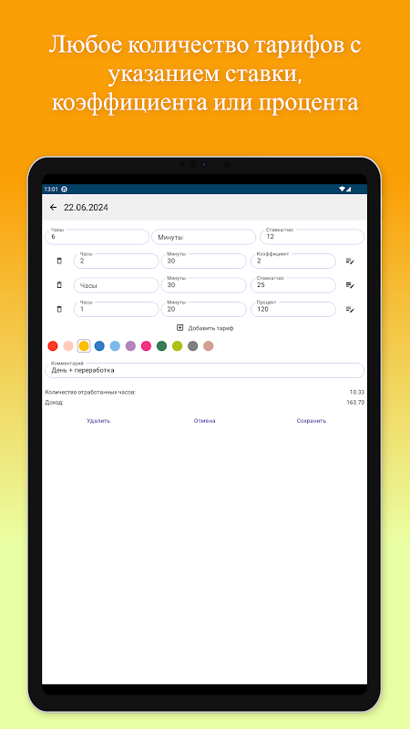 · অতিরিক্ত হার: রেকর্ড ভ্রমণ (দৈনিক) ভাতা, বোনাস, কর, নির্দিষ্ট এবং শতাংশ কাটা। টাইমশীট আপনার চূড়ান্ত বেতন নিজেই গণনা করবে।