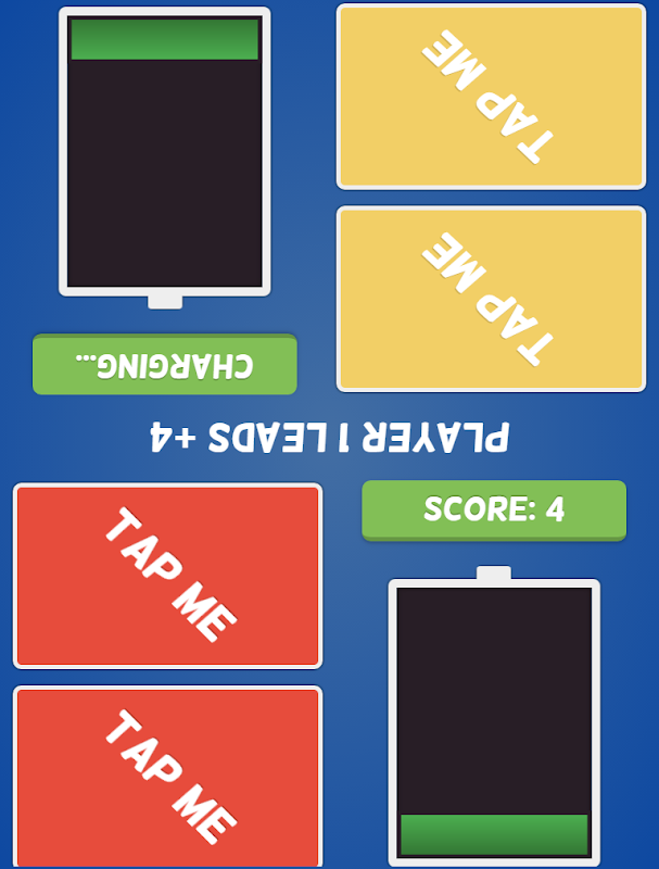 When both players are ready, you start the game by hitting the new game button and you’ll see the pretty gaming screen. Both players sit opposite each other. Once the round and starting notices are gone, game starts. You’ll see a battery, which holds each players energy level (starting with an empty battery - zero energy level). Besides this battery are the tap-fields, with which the points are collected and added to your score. Touch and hold the battery to load energy. If energy is loaded, press the tap fields alternately to collect points. Loading the battery and touch the tap fields at same time is not possible. In that each round has a different duration, you’ll need good reactions and a good feel how long a round could go together with strategic thinking to not unnecessary load your battery to long.