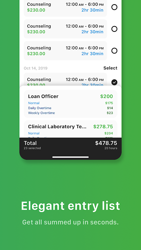 আপনার চূড়ান্ত বেতন লগ, বিলিং এবং উপার্জন ক্যালকুলেটর, ঘন্টার কাজের জন্য টাইমশীট।