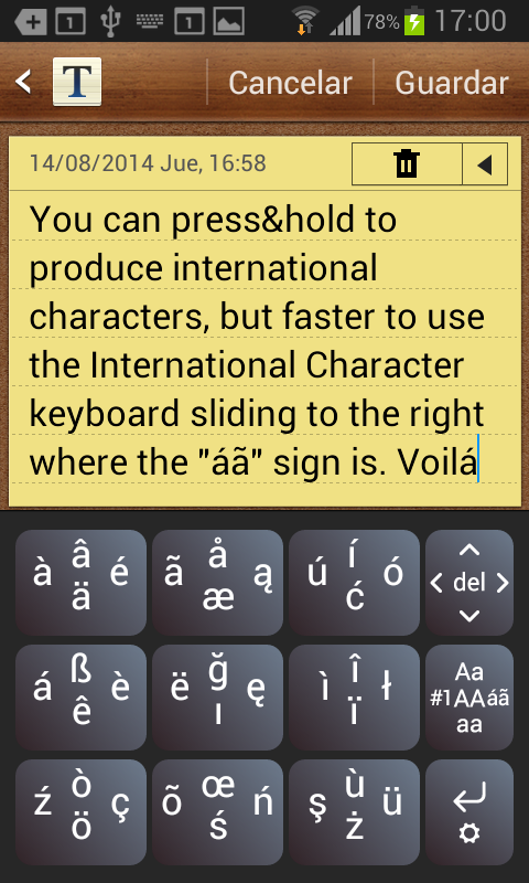 বিকল্প কীবোর্ড কী প্রধান কীবোর্ড না কিছু অক্ষর আছে যা লেখার জন্য ব্যবহৃত হয়. স্লাইড, আন্তর্জাতিক অক্ষরের জন্য ("এএ") ঠিক আছে, একটি মূলধনী প্রাথমিক জন্য ("এএ") ঊর্ধ্বে, সংখ্যা এবং অতিরিক্ত প্রতীকের জন্য ("# 1" প্রতি) ছোট চিঠি কীবোর্ড ফিরে যেতে কৃত ("এএ") বাম এবং প্রেস ("এএ") ক্যাপ চালু.