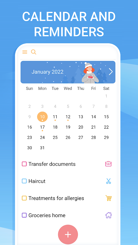 আপনি গুরুত্বপূর্ণ কিছু ভুলে যাবেন না তা নিশ্চিত করতে স্মার্ট রিমাইন্ডারের একটি সুবিধাজনক সিস্টেম ব্যবহার করুন! একক বা নিয়মিত বিজ্ঞপ্তি সেট করুন এবং অ্যাপটি আপনাকে সময়মত আপনার সমস্ত কাজ মনে করিয়ে দেবে।